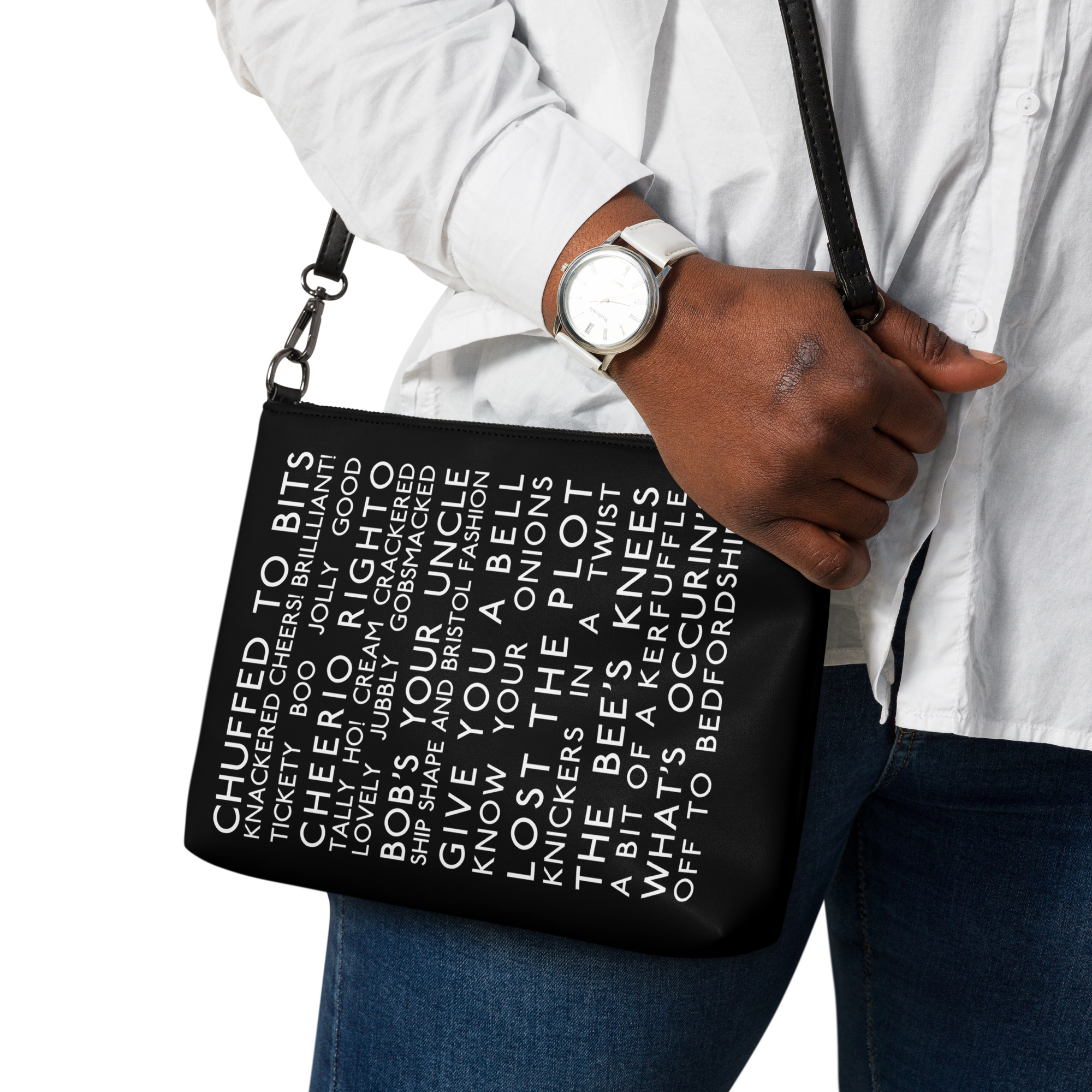 Keep your style on point and your hands free with our versatile crossbody bag. It’s made of premium faux leather and features dark gray hardware. Thanks to the zip-top closure and multiple inside pockets, you can keep your essentials secure and organized. Transform this crossbody bag with removable wrist and shoulder straps to style it for day-to-night looks.