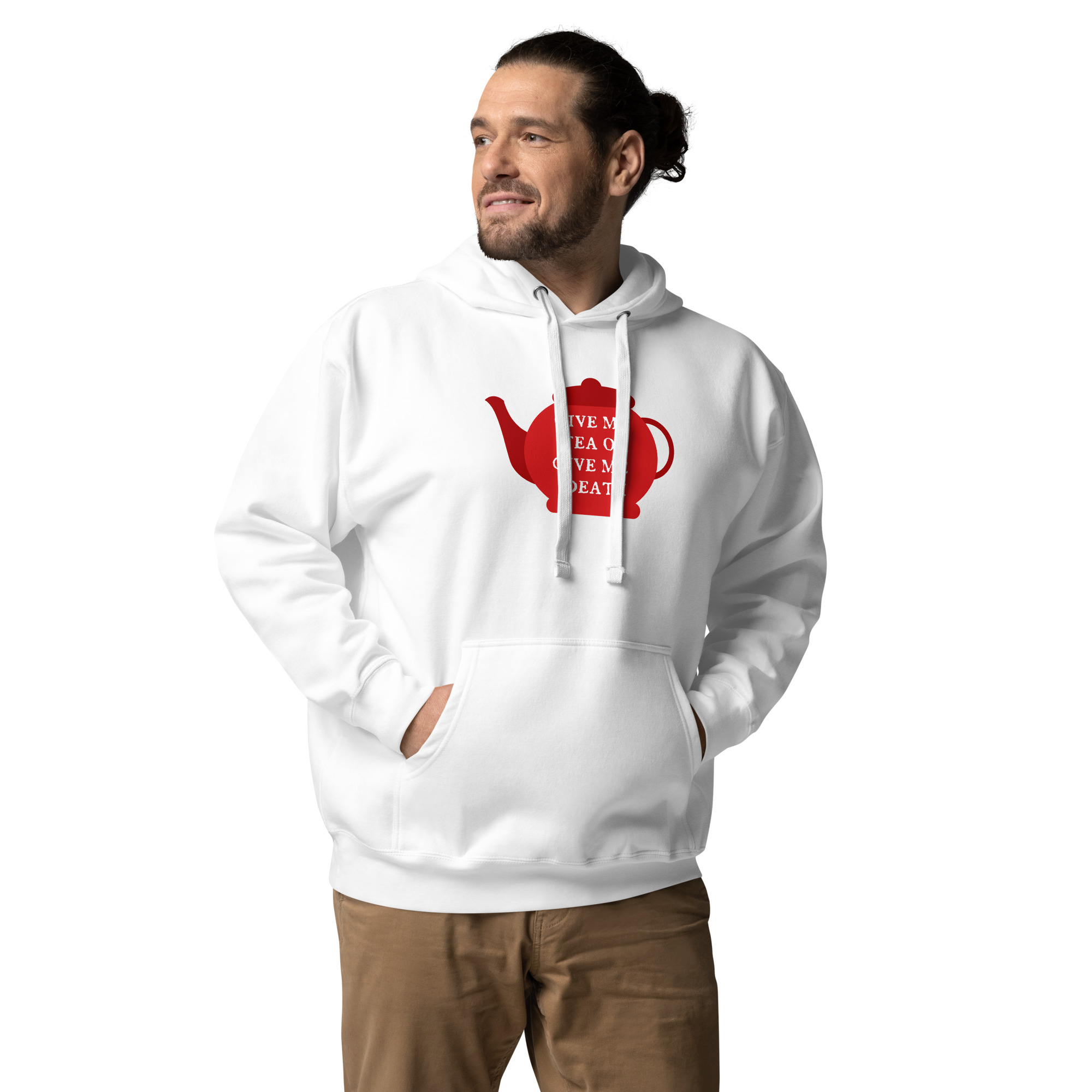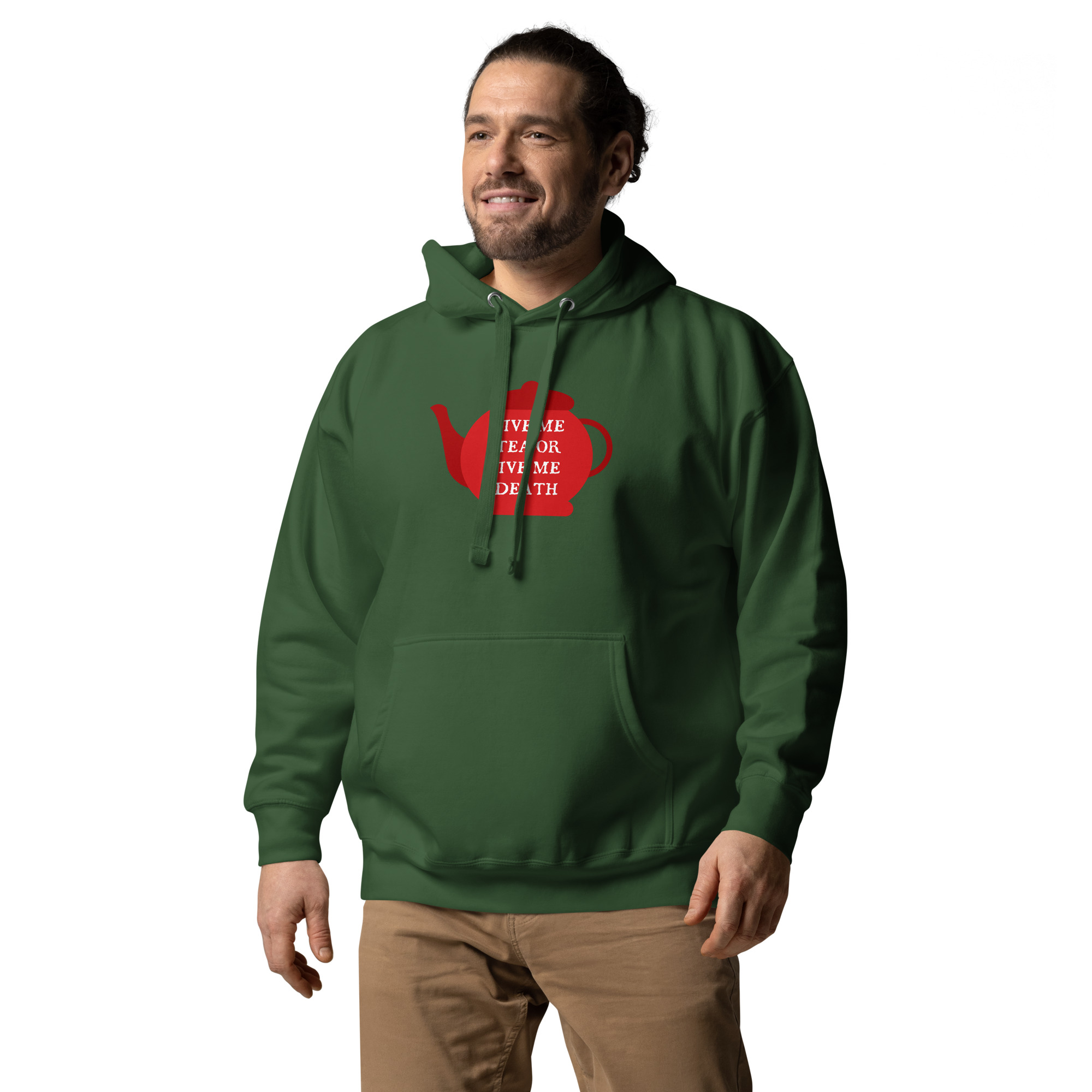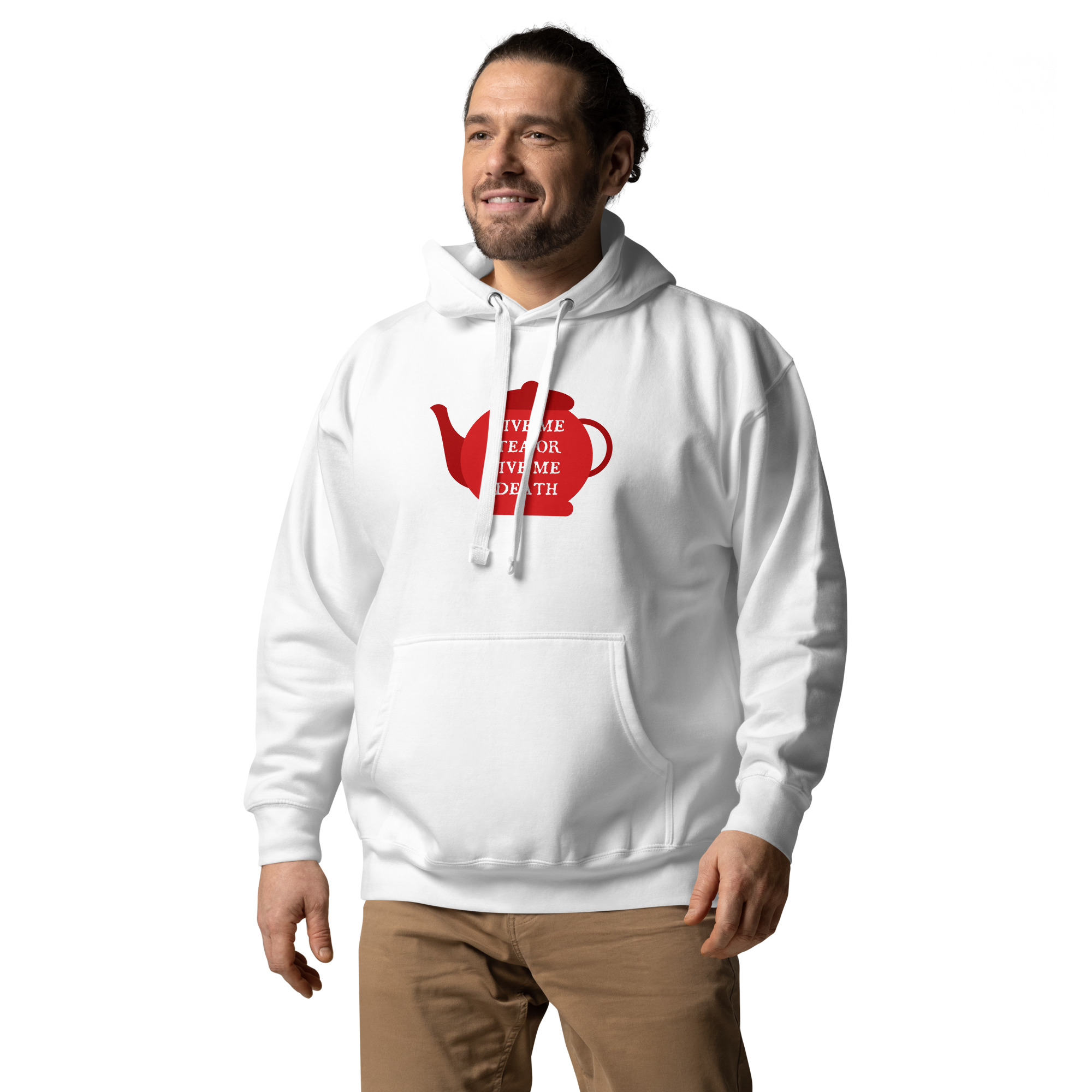 A playful twist on Patrick Henry’s famous revolutionary cry, this design declares “Give Me Tea or Give Me Death” — perfectly capturing the British obsession with tea. For the British, tea isn’t merely a beverage; it’s a national institution, a daily ritual, and the answer to virtually every situation from celebration to crisis.
